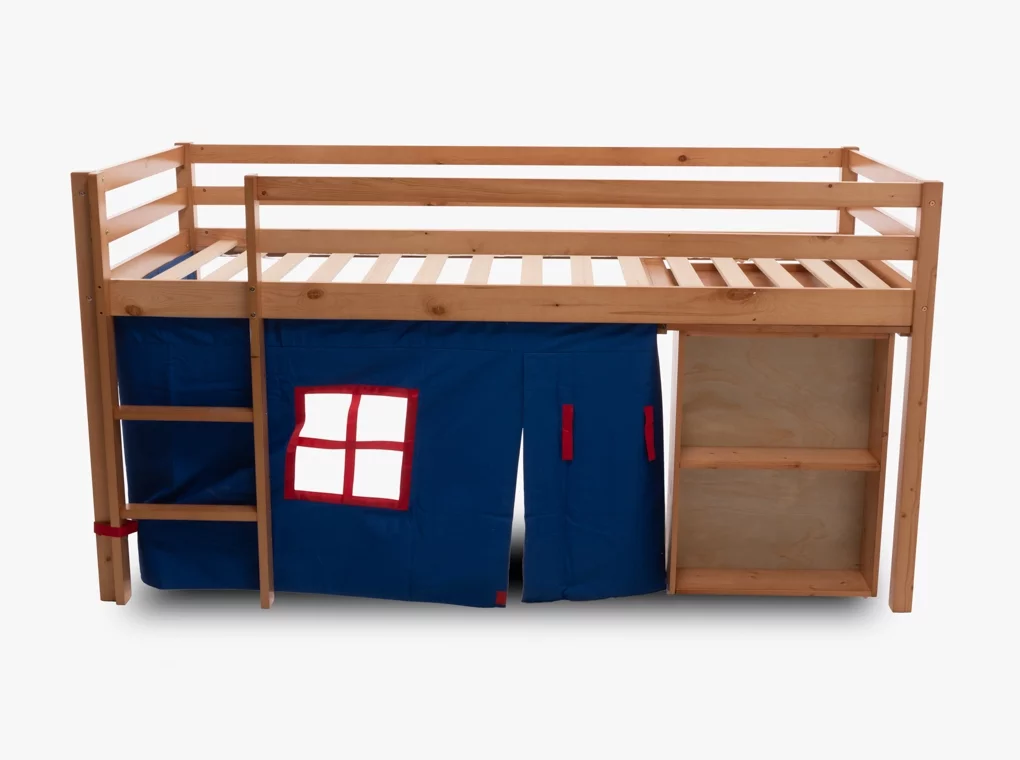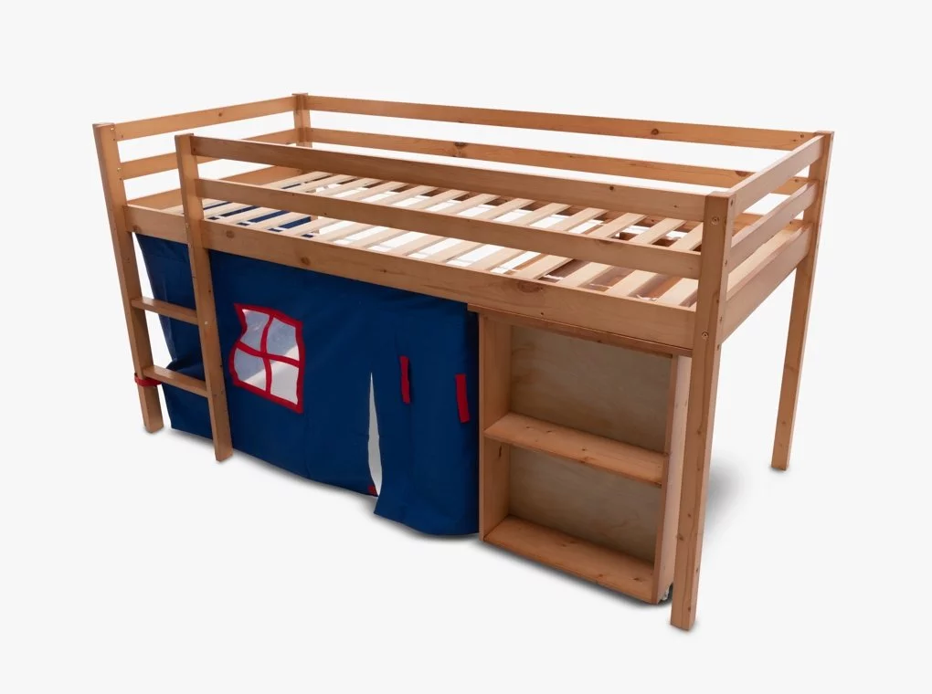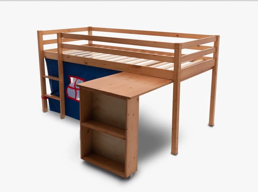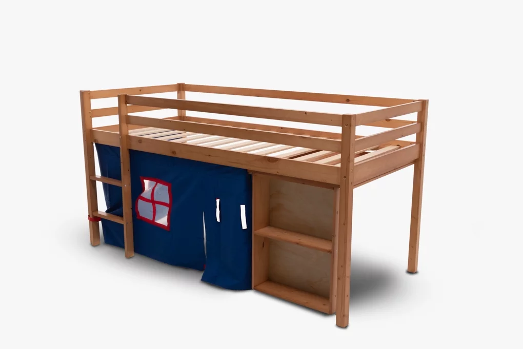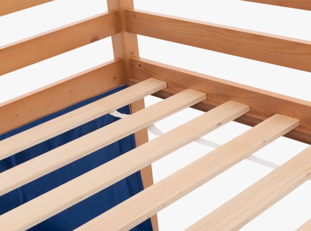 Tömör fenyőből készült ifjúsági ágykeret, kihúzható asztallal. Színe natúr, sátor kék.