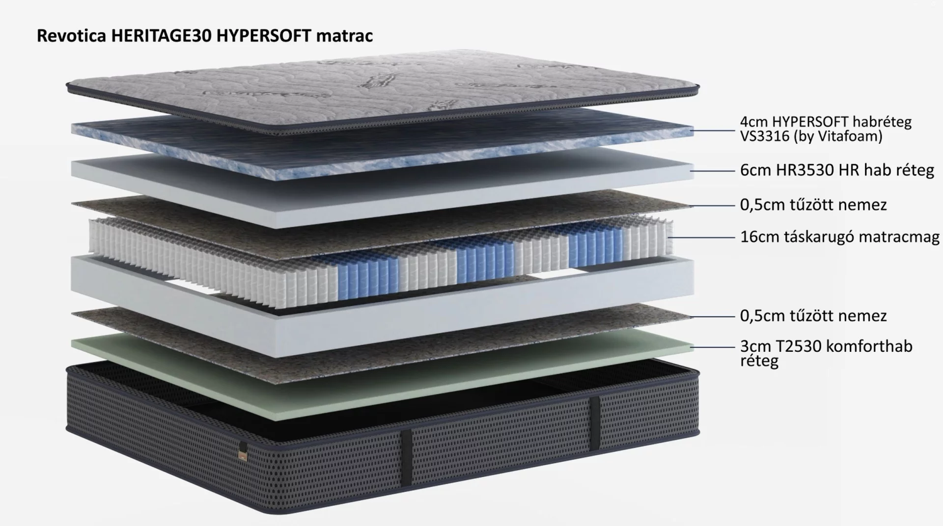 ✔A Heritage30 sorozat matracai peremvarrott technológiával, ún. "pillow-top" komfortréteggel készülnek, masszív, nagytestű, strapabíró táskarugós matracok.